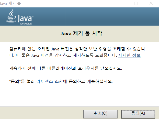 자바 제거 툴로 java를 삭제 후 윈도를 재부팅하는 것을 잊지 말자