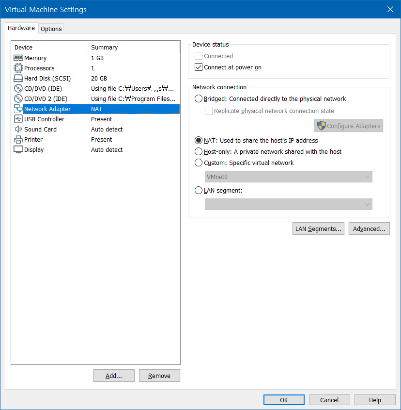 Hardware 탭의 Network Adapter 부분을 NAT로 바꾸어 주어야 가상머신에서도