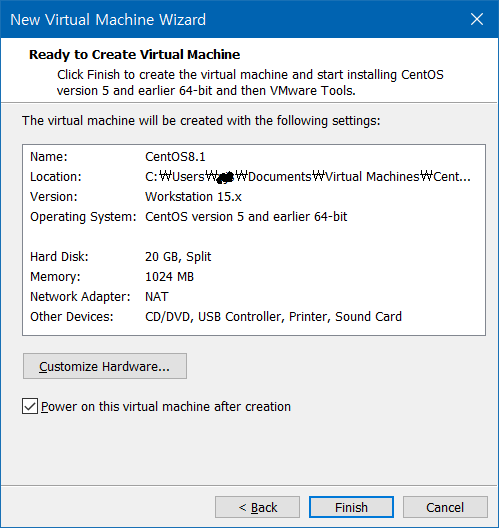 Installer disc image file은 centOS iso이미지를 선택해주자