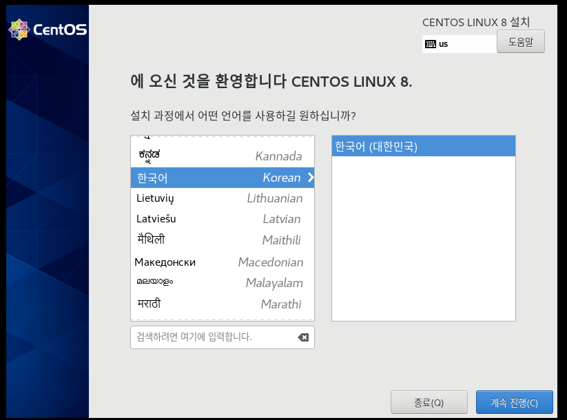 centOS Linix 8 설치 화면이 뜬다. 이제 아래 화면대로 설치를 진행해 나가자.