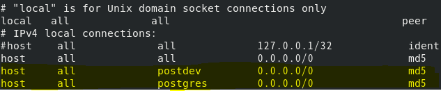 /var/lib/pgsql/data/pg_hba.conf 파일을 아래와 같이 설정한다.