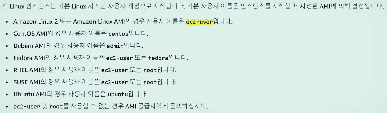 EC2생성후 접속시 os계정 접속시 root는 접속 불가능하다. 아래와 같이 aws os플랫폼 별로 로긴하는 방법을 참고하자